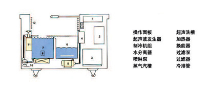 该机采用环保型有机溶剂为清洗剂 ( 例:傲天 D6) ,手动操作完成全部清洗流程。主要由清洗系统,循环过滤系统、制冷系统、电器控制系统等组成。